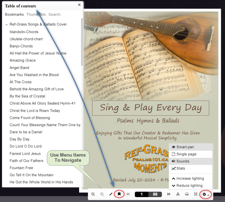 The 3D Flip Book format allows access to the most current Ref-Grass Song Book anytime and from anywhere on almost any mobile device. The book may also be downloaded as a complete PDF document or a single page to print.